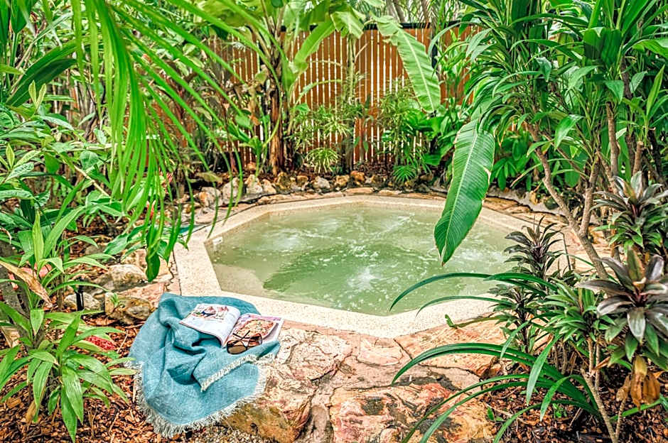 This villa is nestled within the tropical gardens of the resort with the wooden decks facing towards the Esplanade parkland. The villa features wooden decks with a table, chairs and electric BBQ. Complete with glass sliding doors and louvers they allow for true tropical living. Sheer and block out curtains provide natural light during the day and privacy when required.